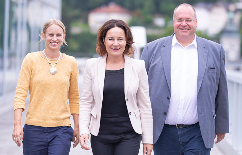 NRin Cornelia Ecker (Bildmitte, landesweite SPÖ-Spitzenkandidatin & im Regionalwahlkreis 5B) gemeinsam mit NR Walter Bacher (Spitzenkandidaten im Regionalwahlkreis 5C) und Michaela Schmidt (Spitzenkandidatin in der Stadt Salzburg - RWK 5A) bei der Pressekonferenz im UnikumSky auf der Dachterrasse des Uniparks im Nonntal (Foto: SPÖ/Arne Müseler).