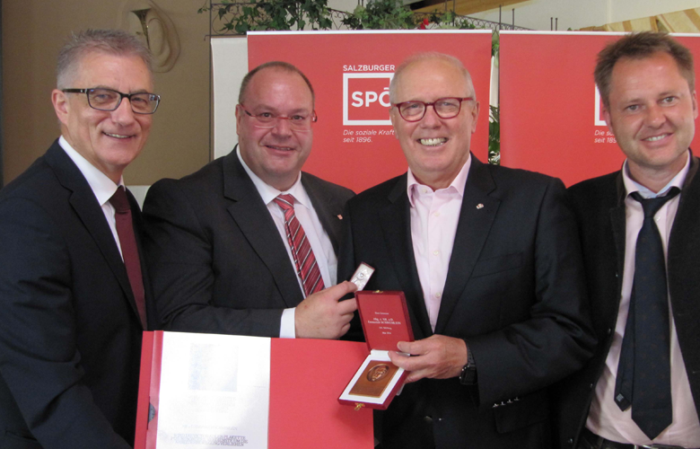 Foto unten: Abg. z. NR a.D. Emmerich Schwemlein (dritter v.l.) wurde für seine Verdienste für die Pinzgauer SPÖ mit der höchsten Auszeichnung der Sozialdemokratie – der Victor-Adler-Plakette - ausgezeichnet. Landesparteivorsitzender LAbg. Walter Steidl, Bezirksvorsitzender Abg.z.NR Walter Bacher und LAbg. Karl Schmidlechner gratulierten sehr herzlich.